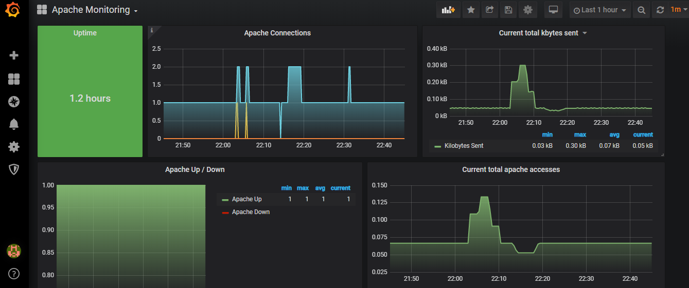 Learn MoreAs soon as you launch the instance you will start seeing the metrics. We have built a decent set of metrics which will help you to start monitoring the Apache Webserver right away. Click on any of the links in the Grafana or Prometheus section to see a sample dashboard. You will be able to add more metrics to the same dashboard and tweak any of the parameters to customize to your needs